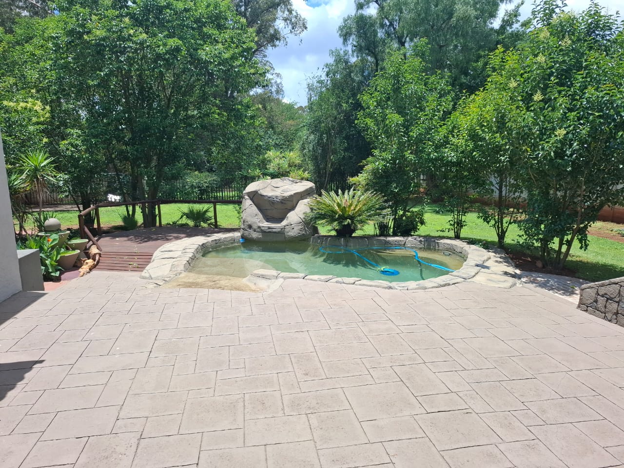 -A beautiful water feature swimming pool set in a large yard